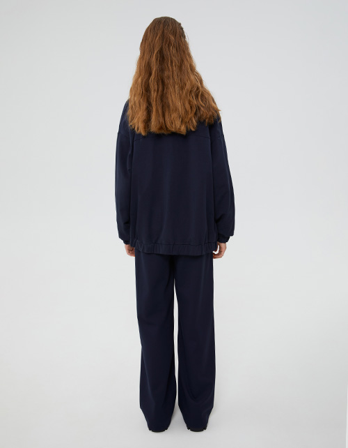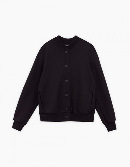 Стильный тёмно-синий жакет-бомбер для девочки. Модель оверсайз. Спущенная линия плеча. Воротник из эластичной рибаны. Манжеты и низ изделия со сборкой на резинке. Карманы в боковых швах. Комфортная застёжка на кнопки.