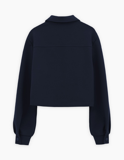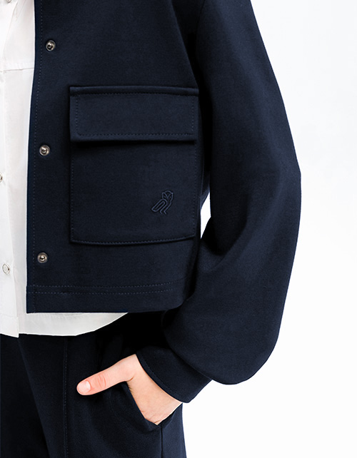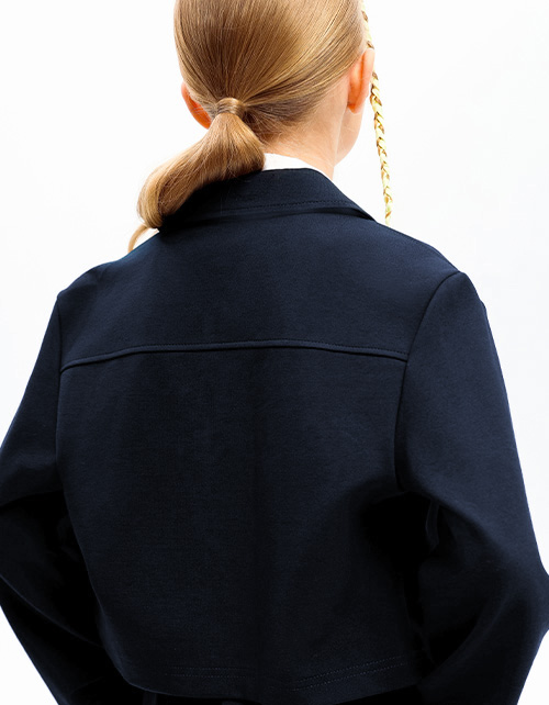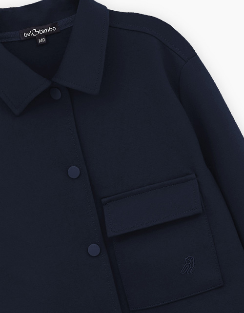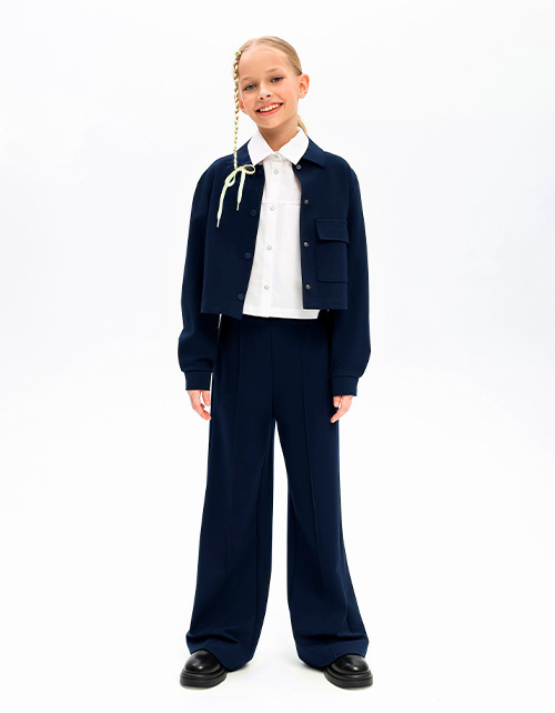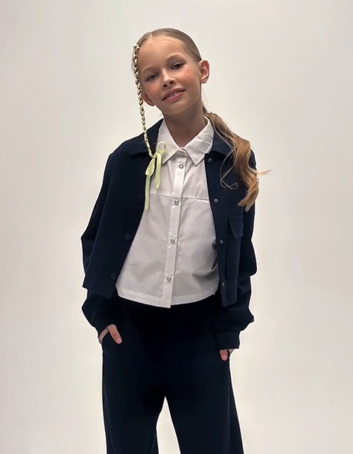 Тёмно-синий укороченный жакет для девочки. Модель дополнена глубоким утилитарным накладным карманом, декорированным деликатной авторской вышивкой. Жакет с застёжкой на кнопки с покрытием софтач. Стильный образ в паре с широкими брюками или юбкой.