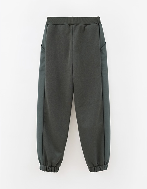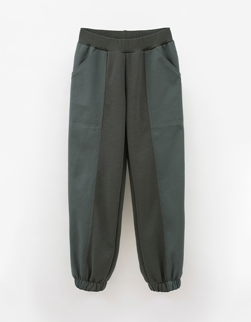 Брюки благородного серо-зелёного оттенка для мальчика. Комбинированная модель из футера и твила. Прямая модель, со средней посадкой. Изделие на мягком поясе. Эластичные манжеты на ленте. Брюки дополнены боковыми карманами.