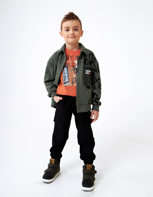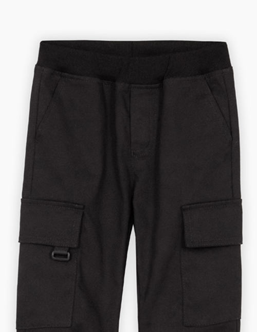 Модные чёрные брюки-карго для мальчика. Модель со средней посадкой на мягком поясе и резинкой по низу. Изделие из тактильно приятного твила. Брюки с боковыми накладными объёмными карманами с репсовой лентой.