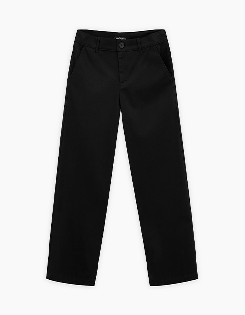 Чёрные брюки из твила. Модель прямого силуэта и средней посадкой. Пояс с внутренней регулировкой. Есть шлёвки для ремня. Застёжка на молнию и пуговицу. Внутри карманы из 100% хлопка. Для улучшения характеристик, твил прошёл дополнительную обработку.