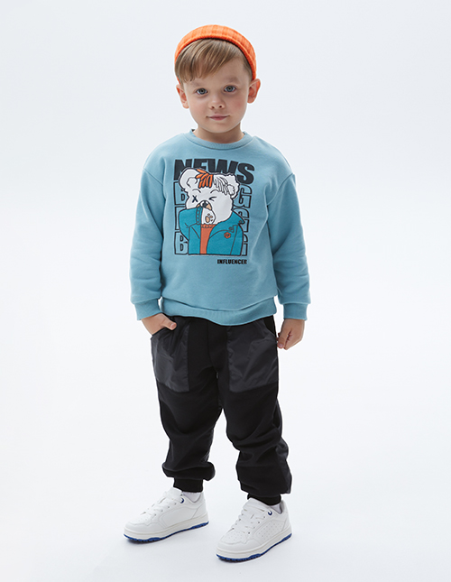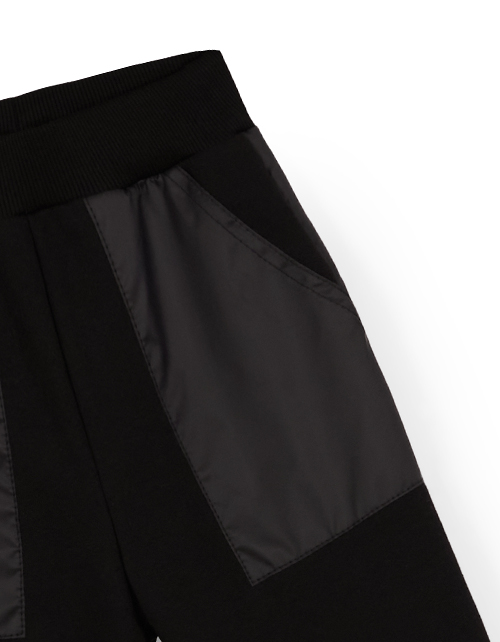 Чёрные брюки-джоггеры для мальчика. Прямая модель со средней посадкой. Изделие без застёжки, на мягком поясе. Манжеты из рибаны. Брюки из футера с накладными карманами из плащевой ткани. Сзади плащевая ткань - комфорт и удобство в прохладную погоду.