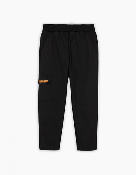 Чёрные брюки-карго для мальчика. Модель объёмного силуэта со средней посадкой. Изделие без застежки, на мягком эластичном поясе. Брюки дополнены накладными карманами-карго. Сочетание футера и твила обеспечивает комфорт и стиль.