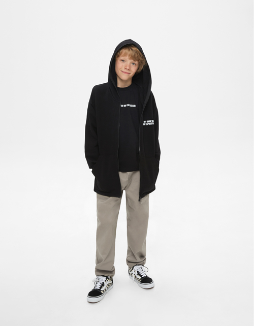 Серо-коричневые брюки для мальчика. Прямая модель со средней посадкой. Изделие снизу на кулисах с регулировкой, за счёт чего можно создавать разные образы. Максимально комфортные брюки из твила.