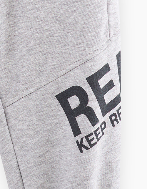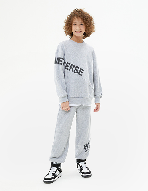 Комфортные базовые брюки в оттенке серый меланж для мальчика. Прямая широкая модель. Мягкие манжеты по низу. Изделие на мягком поясе, со средней посадкой. Карманы в шве. Авторский шрифтовой принт. Составит расслабленный образ с артикулом 240119.