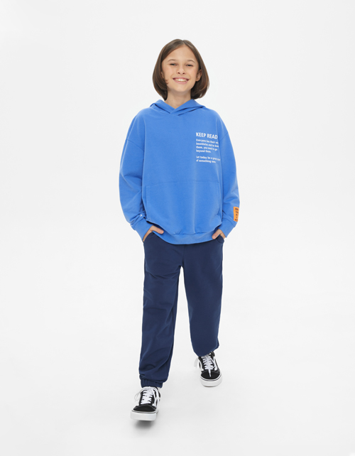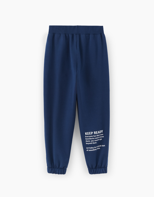 Тёмно-синие брюки-джоггеры для мальчика. Прямая модель, снизу на резинке. Базовое изделие со средней посадкой. Комфортные брюки из футера на мягком поясе.