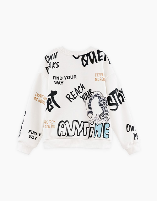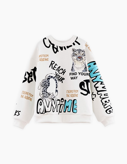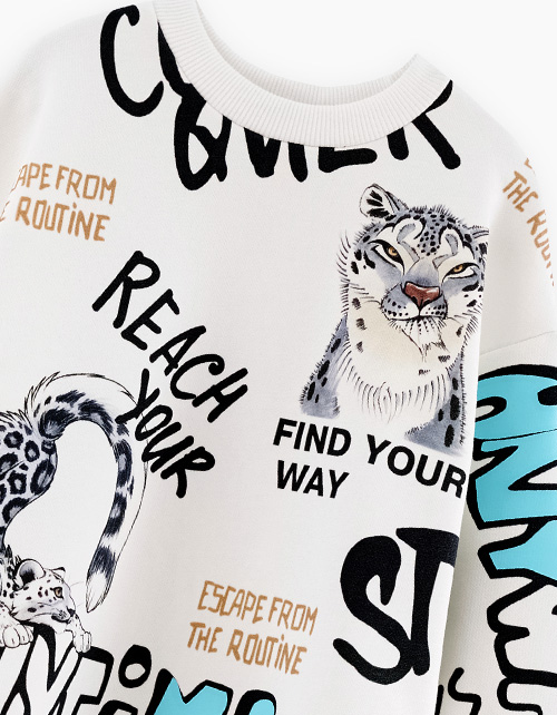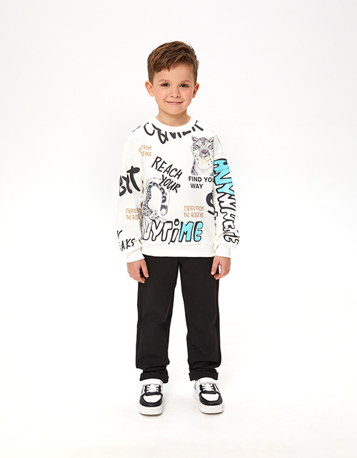 Дизайнерский свитшот оттенка молоко для мальчика. Модель прямого объёмного силуэта. Приспущенная линия плеча. Воротник, манжеты и низ изделия из эластичной рибаны. Почерковая модель бренда декорирована авторскими принтами.