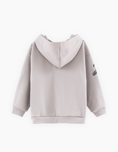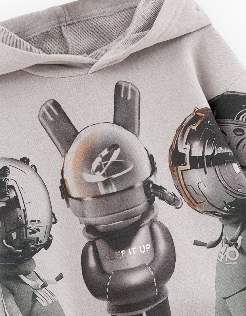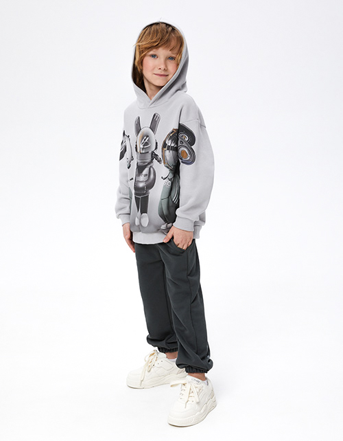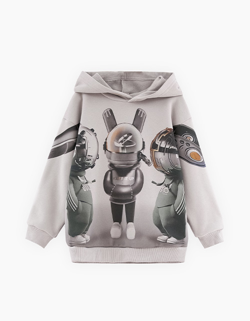 Худи оттенка серая дымка. Модель прямого объёмного силуэта с глубоким капюшоном. Приспущенная линия плеча. Манжеты и низ изделия из эластичной рибаны. Худи из футера с бархатистым эффектом декорировано дизайнерским принтом, с использованием DTF печати.