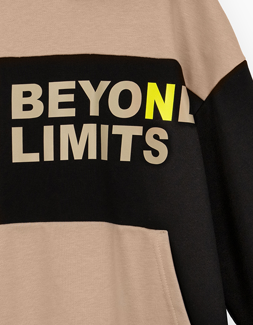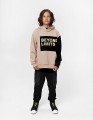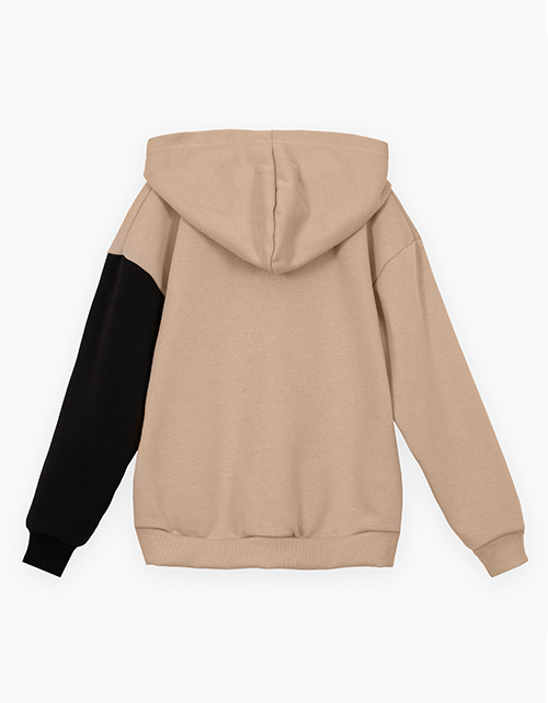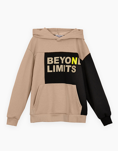 Худи бежевого оттенка для мальчика. Модель прямого силуэта со спущенной линией плеча. Манжеты и низ изделия из рибаны. Худи с капюшоном и накладным карманом-кенгуру. Контрастный один рукав. Худи декорировано авторским принтом.