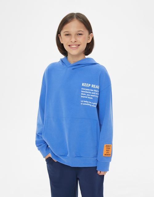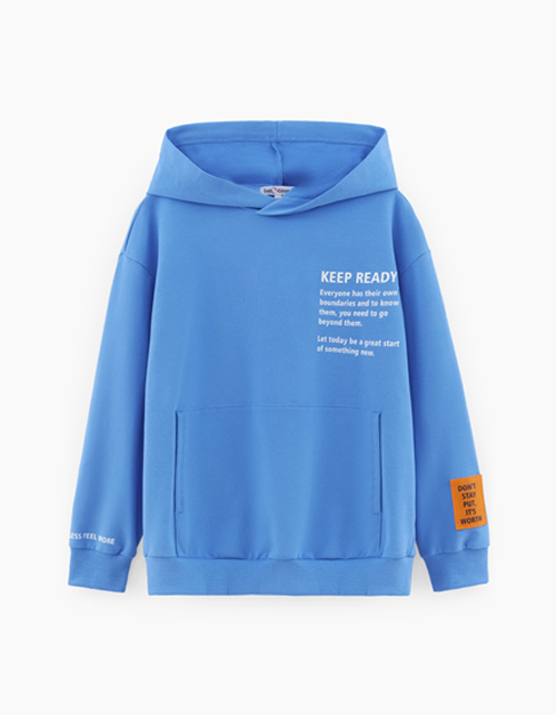 Лазурное худи для мальчика. Прямая модель со спущенной линией плеча. Изделие из футера с браш-эффектом декорировано дизайнерской нашивкой-лэйбой.