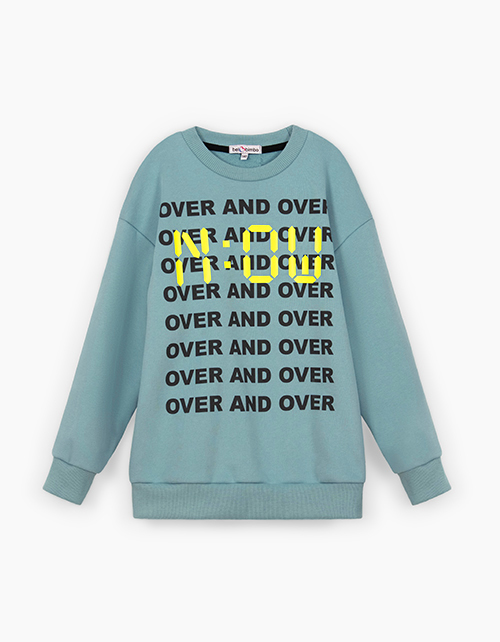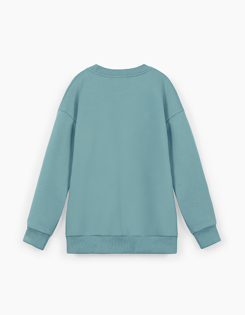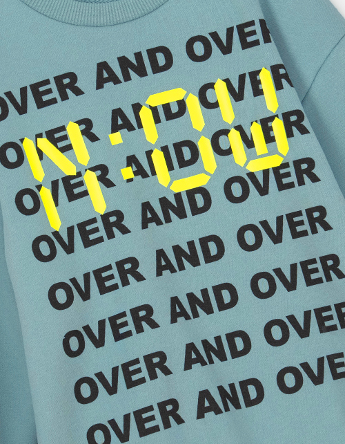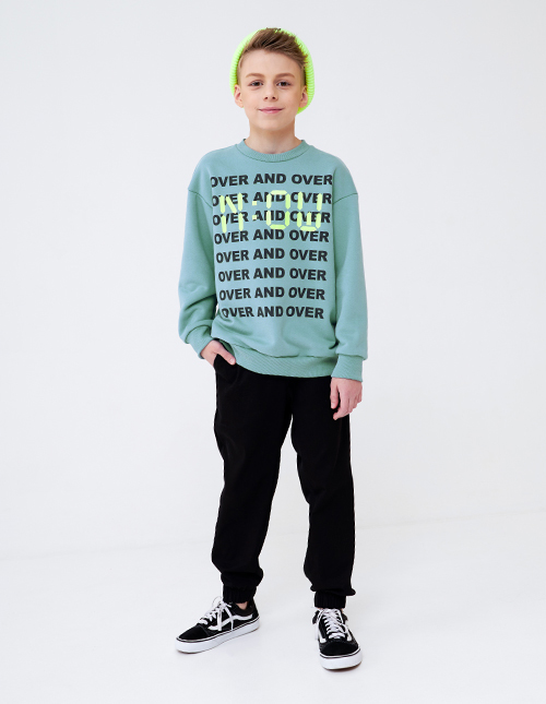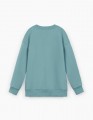 Свитшот в трендовом оттенке лёд для мальчика. Модель прямого силуэта со спущенной линией плеча. Изделие из футера с браш эффектом. Низ, рукава и горловина из рибаны. Свитшот декорирован дизайнерским принтом.