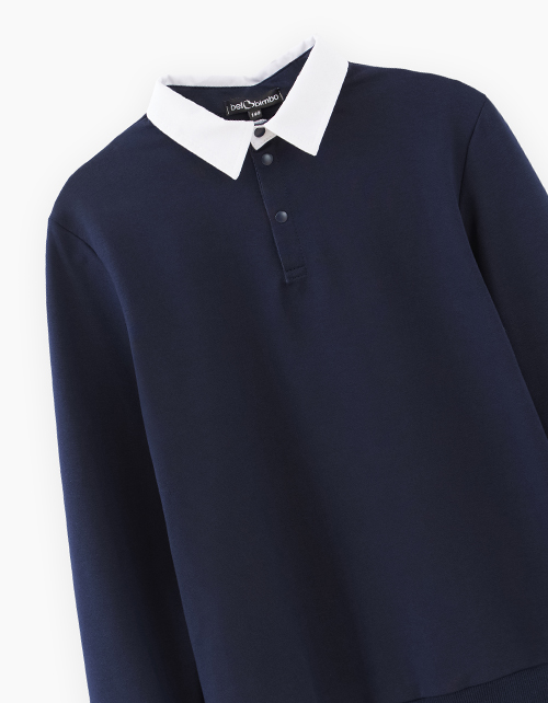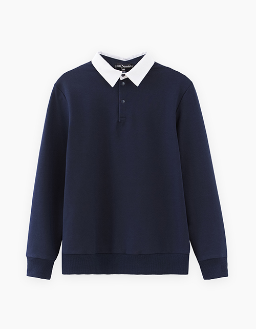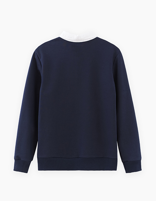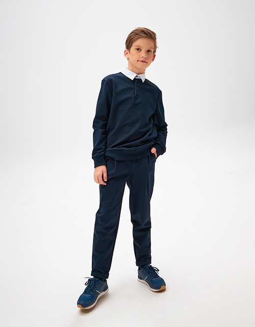 Трендовый школьный джемпер-обманка для мальчика. Модель прямого силуэта. Имитирует комплект из белой рубашки и тёмно-синего джемпера. Удобная застежка-поло на кнопки.