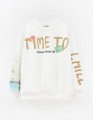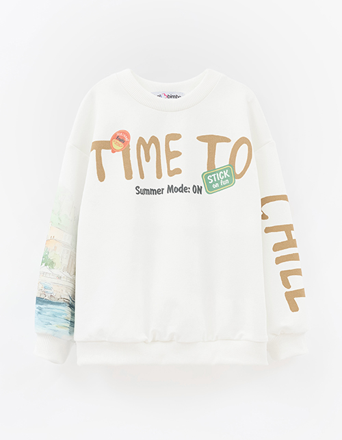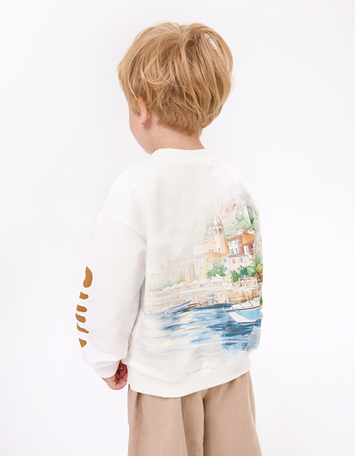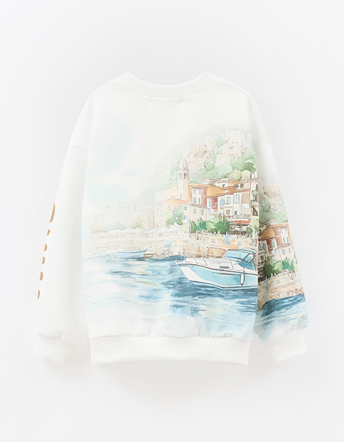 Молочный свитшот в расслабленном прямом силуэте с мягким объёмом по низу. Пейзажный дизайн с сицилийскими нотками создан цифровой печатью и DTF?плёнкой. Длинные рукава и мягкая отделка горловины обеспечивают комфорт и солнечное настроение модели.
