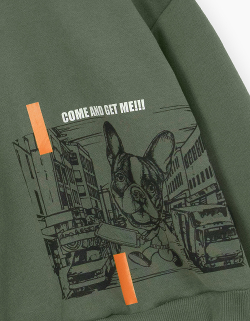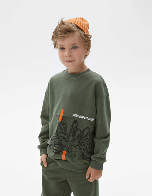 Комфортный свитшот для мальчика. Модель прямого силуэта со спущенной линией плеча. Низ и манжеты из рибаны. Свитшот выполнен из тактильно приятного футера с браш-эффектом. Модель декорирована стильным авторским принтом.