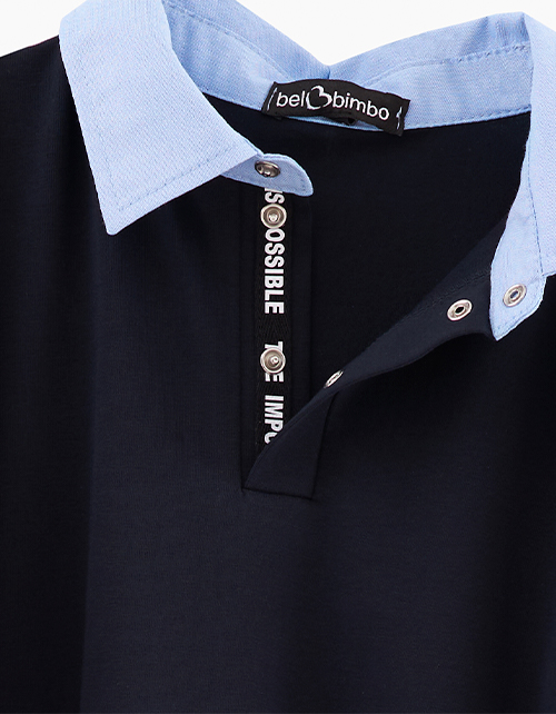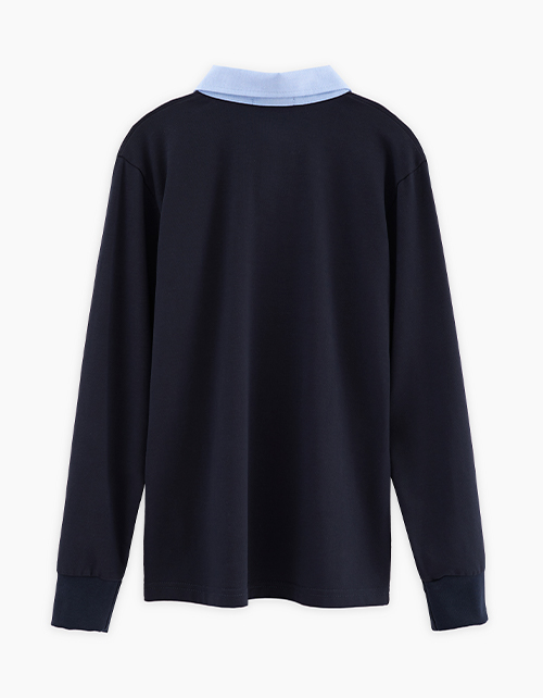 Тёмно-синий лонгслив с рубашечным воротником для мальчика. Модель прямого силуэта. Застёжка поло на кнопки. Контрастный воротник. Строго соблюдайте правила стирки из дополнительной памятки.