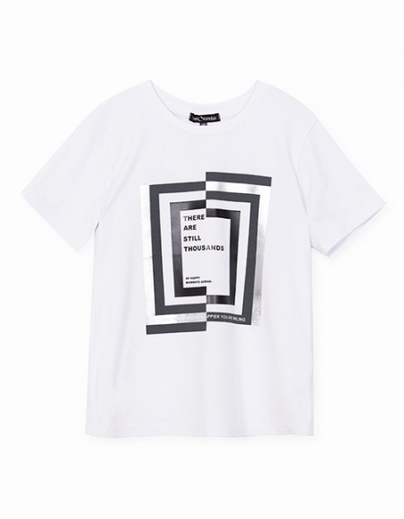 Дизайнерская белая футболка для мальчика. Прямая объёмная модель. Спущенная линия плеча. Эластичная горловина. Футболка с центральным авторским принтом в виде абстрактного коллажа с ноткой юмора.
