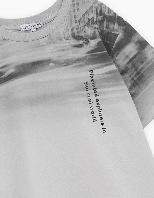 Дизайнерская футболка интересного серо-зелёного оттенка для мальчика. Прямая объёмная модель. Спущенная линия плеча. Эластичная горловина. Футболка с авторским принтом, безопасная и качественная трансферная печать.