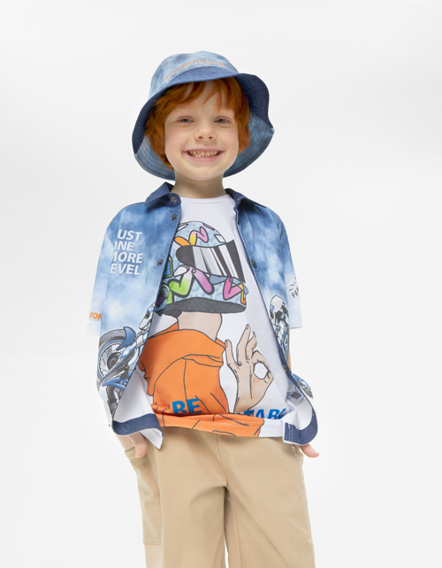 Панама для мальчика. Модель из джинса и сорочечной ткани. Изделие декорировано принтом.