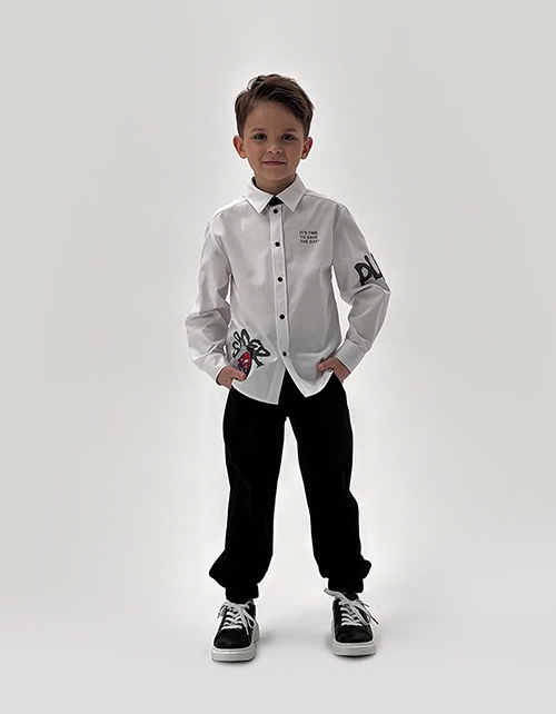 Белая рубашка для мальчика. Модель комфортного прямого силуэта. Комфортная застёжка на кнопки. Рубашка декорирована авторским цифровым принтом, инновационной DTF и трансферной плёнкой.
