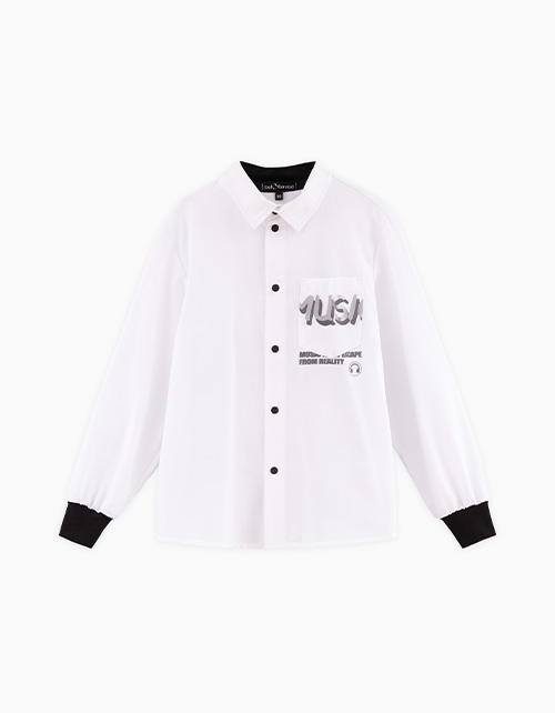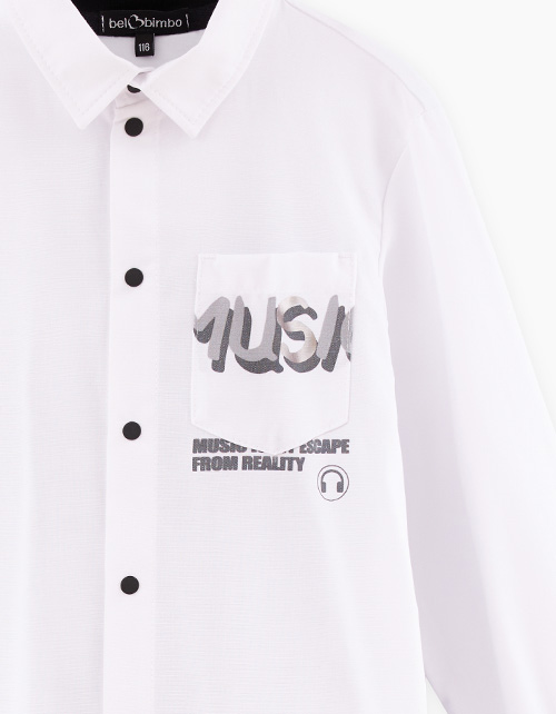 Рубашка для мальчика. Модель прямого силуэта. Воротник отложной, сзади - стойка из эластичной рибаны. Комфортная застёжка на кнопки. Манжеты из рибаны. Накладной карман. Рубашка декорирована авторскими цифровыми и трансферными печатями. Акцентная спинка.
