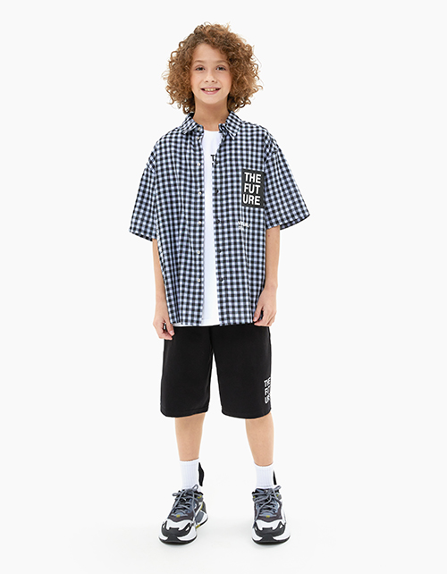 Клетчатая рубашка для мальчика. Модель прямого объёмного силуэта. Спущенная линия плеча. Комфортная застёжка на кнопки. Рубашка декорирована авторскими принтами. Составит модный образ с артикулами 240143 и 240140 или 241145 и 240141.