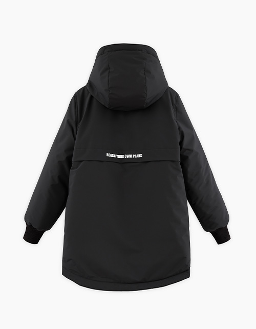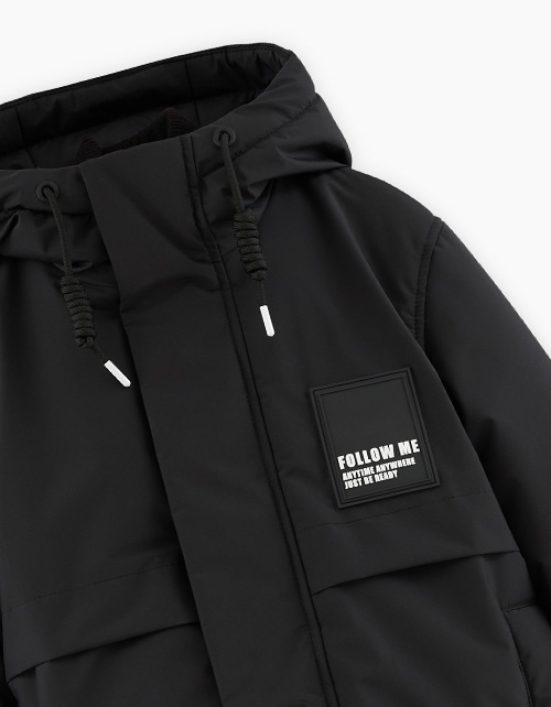Чёрная парка для мальчика. Функциональные шнурки по капюшону. Ветрозащитная планка на кнопках. Карманы на флисе. Мягкие эластичные манжеты и воротник. Гипоаллергенный наполнитель. Дышащая подкладка. Авторский лаконичный декор. Рекомендовано до -20.