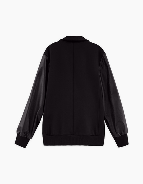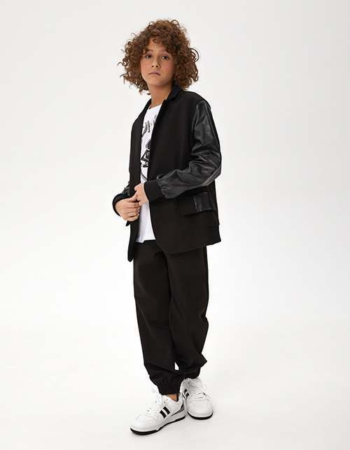 Оригинальный пиджак для мальчика. Модель прямого силуэта. Отложной воротник с лацканами. Манжеты и низ изделия по спинке из эластичной рибаны. Имитация карманов Комбинация материалов: трикотажное полотно и эко-кожа. Застёжка на пуговицы. Авторский декор.
