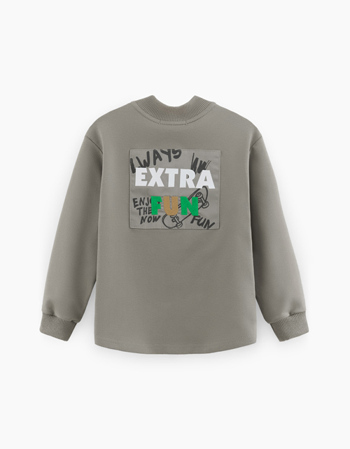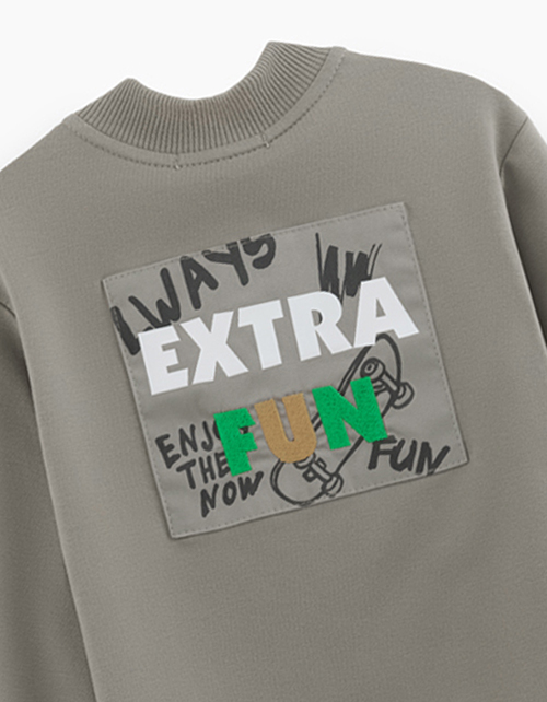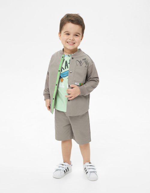 Стильный серо-коричневый жакет-рубашка для мальчика. Модель прямого силуэта. Изделие из комбинации материалов: футер и твил. Жакет декорирован акцентным авторским принтом на спинке.