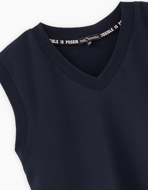 Стильный тёмно-синий школьный жилет для мальчика. Модель прямого силуэта. Спущенная линия плеча. V-образный вырез горловины. Деликатный авторский принт на спинке и скрытый на ленте. Комфортное изделие из футера станет отличной базой гардероба школьника.