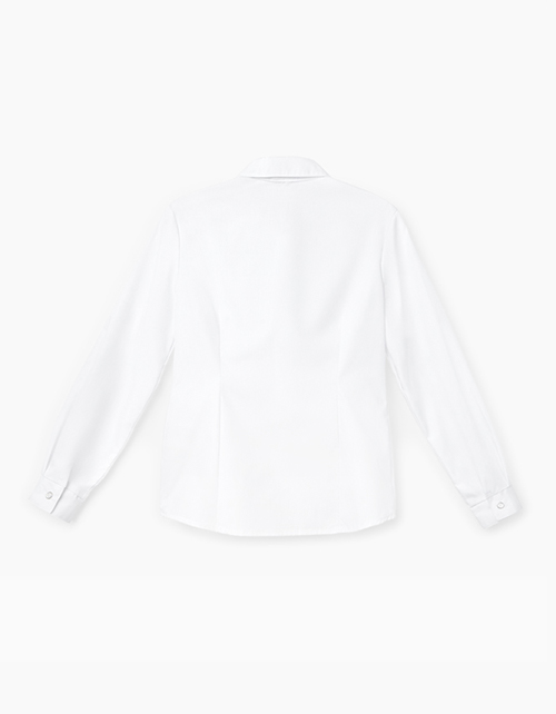 Белая блузка полуприталенного силуэта, с длинным рукавом и рубашечным воротником. С застежкой на пуговицы. Выполнена из сорочечной ткани. Декорирована фирменной вышивкой на манжете и галстуком из ткани в черно-белую клетку vichy