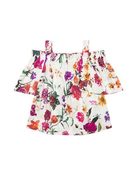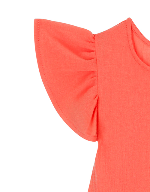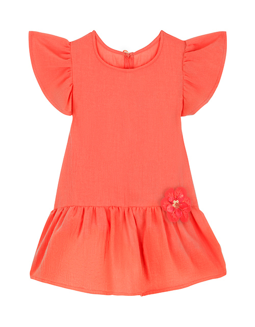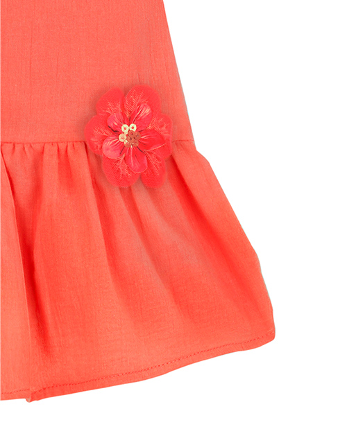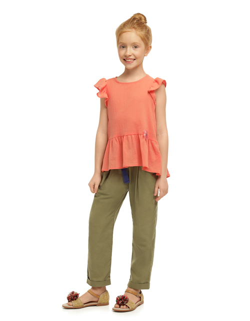 Коралловая блузка для девочки свободного силуэта. Застежка по горловине спинки на петлю и пуговицу. Декор в виде нашивок, сетчатого полотна и пайеток. Оформление в стилистике капсулы "Цветочное сафари".