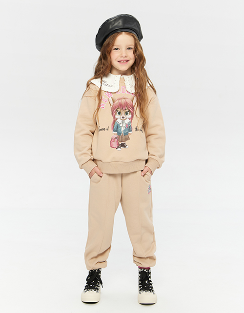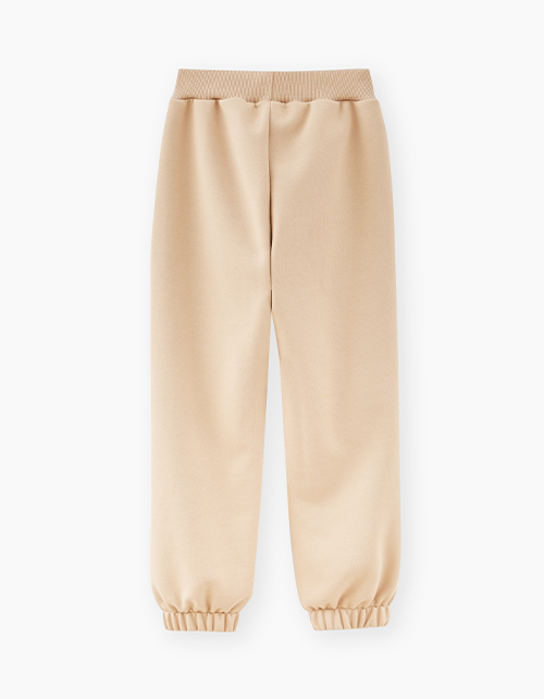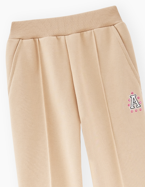 Стильные бежевые брюки-джоггеры для девочки. Комфортная модель на эластичом поясе и с боковыми карманами. Декорированы стразами и вышивкой.