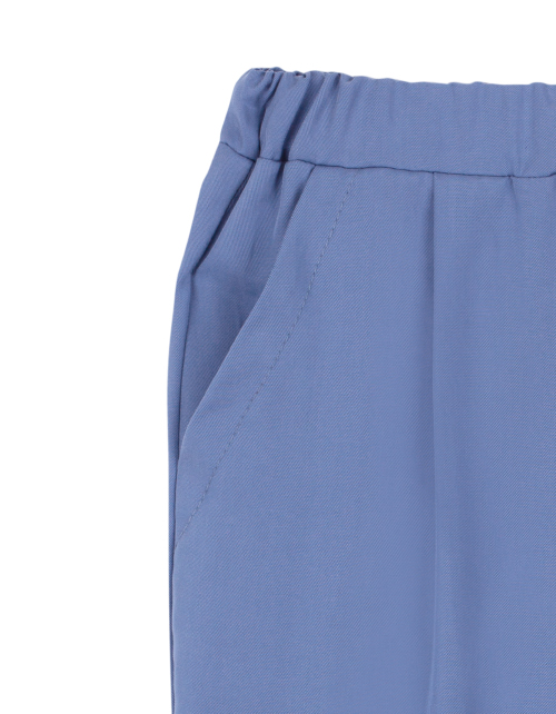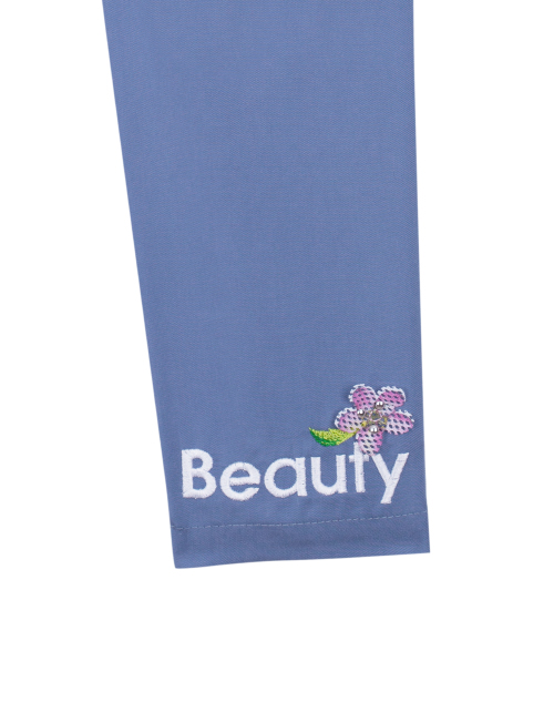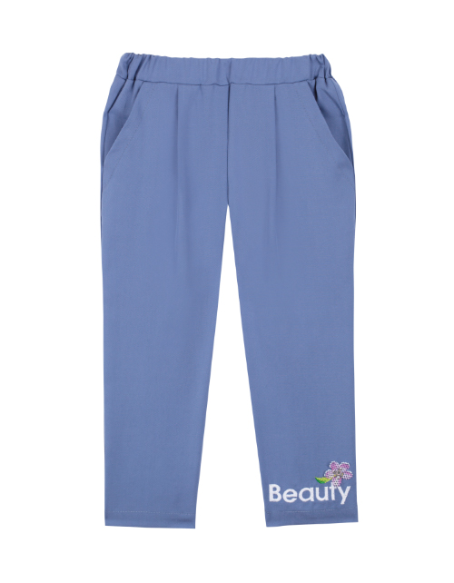 Брюки для девочки цвета деним на резинке. Зауженный книзу силуэт. Боковые карманы. Принт в стилистике капсулы "Нежный румянец".