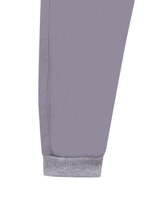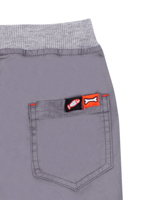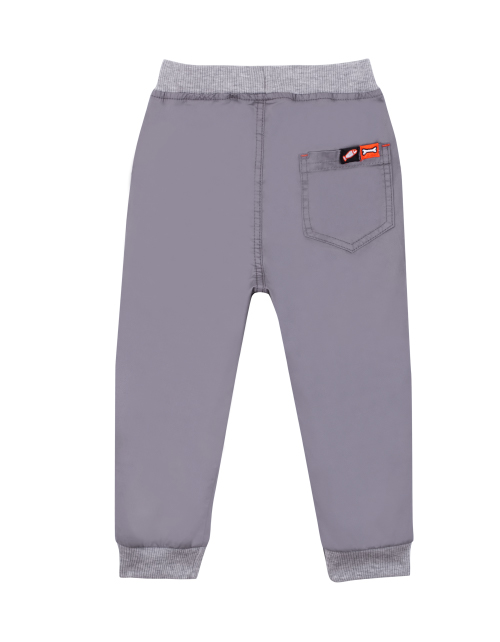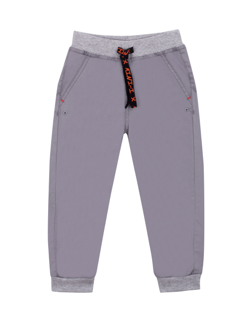Повседневные брюки для мальчика свободного силуэта серого цвета. Пояс на резинке дополнен контрастным шнурком. Два кармана спереди и накладной карман в задней части. Изделие дополнено манжетами и стильными нашивками.