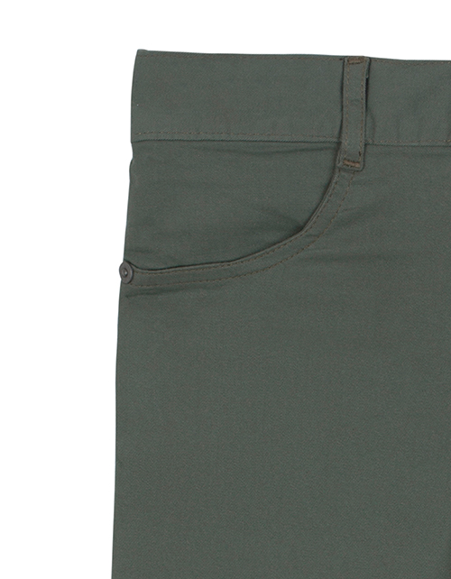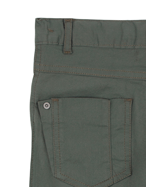 Брюки для мальчика цвета хаки прямого силуэта. Передние и задние накладные карманы. Декоративные клепки и шлёвки по поясу.