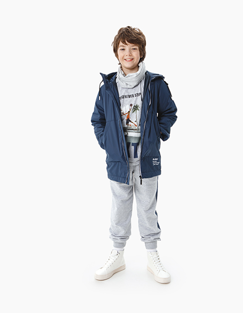 Комфортные брюки-джоггеры для подростка выполнены из серого меланжевого футера, с манжетами и эластичным поясом из рибаны в тон. Стильный акцент в виде контрастного лампаса с текстовым принтом вдоль левого бокового шва. Вместительные боковые карманы