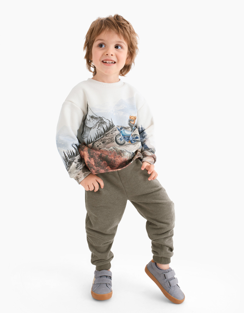 Брюки зауженного кроя выполнены из меланжевого футера цвета хаки. Эластичный пояс и манжеты - из рибаны в тон основной ткани. Вместительные прорезные карманы по бокам и декоративная отстрочка спереди делают модель функциональной и стильной.