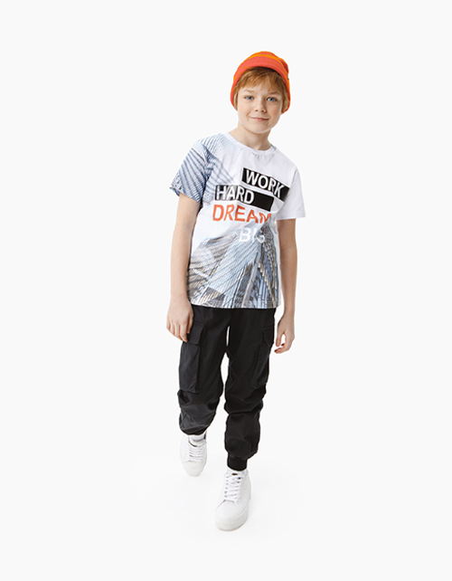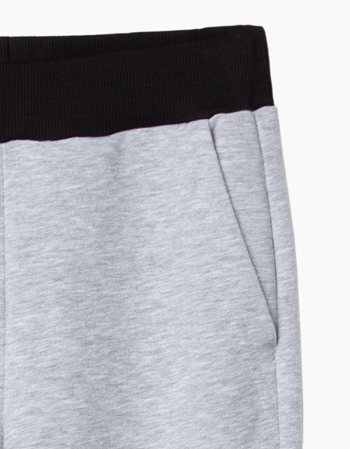 Брюки-джоггеры с вместительными боковыми карманами. Выполнены из серого меланжевого футера с отделкой из ткани черного цвета на поясе и внизу брючин, которые регулируются шнуром на карабине. Слева сзади - контрастная надпись Positive ("Позитивный")