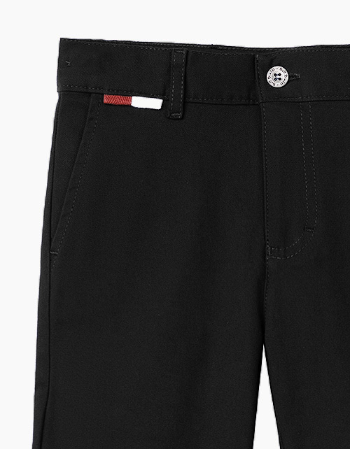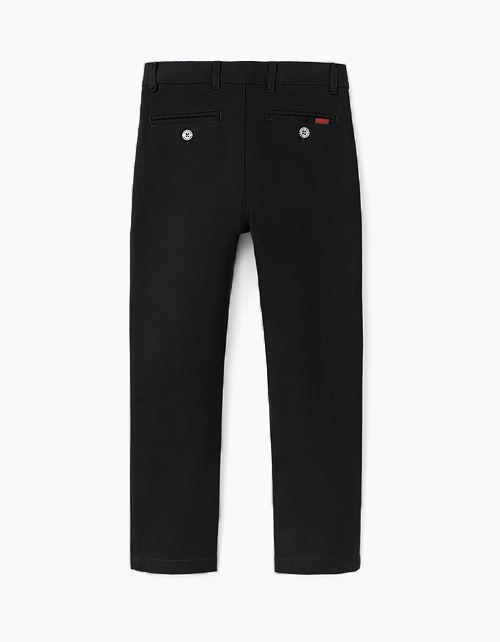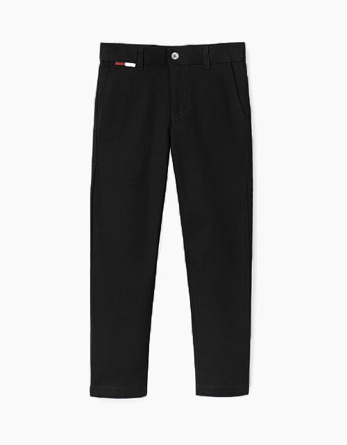 Черные брюки из твила узкого прямого силуэта для мальчика. Регулировка по талии эластичной лентой с застежками. Функциональные карманы. Двухцветная тесьма, вставленная в поясной шов спереди, создает модный акцент.