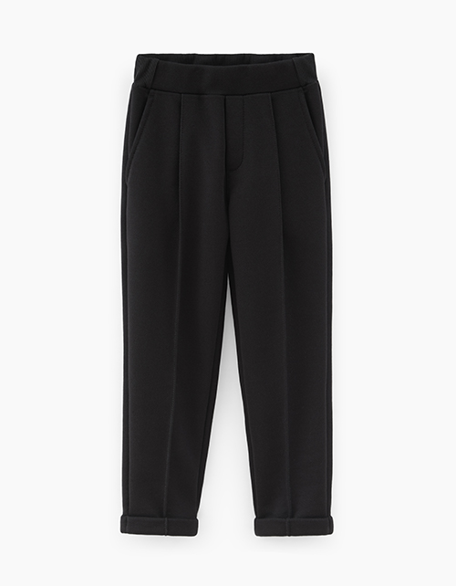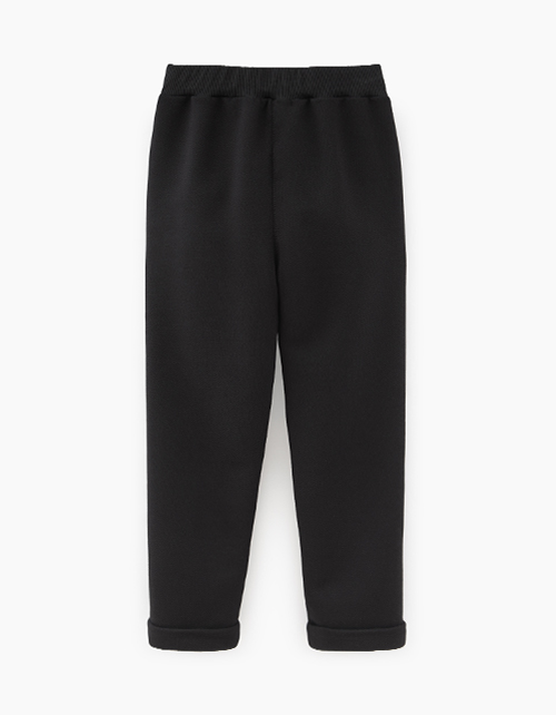 Стильные черные брюки-джоггеры для мальчика. Модель модной формы на эластичном поясе и с отворотами. Наклонные боковые карманы. Возможность регулировки по поясу.