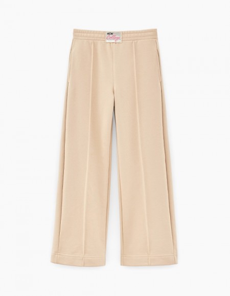 Брюки комфортного, зауженного книзу силуэта, с удобными карманами. Выполнены из трехниточного футера. С поясом из рибаны на эластичной ленте. Декорированы шрифтовой аппликацией из медной пленки внизу справа. Отлично сочетаются с любым верхом коллекции.
