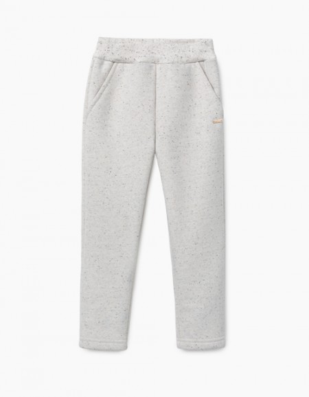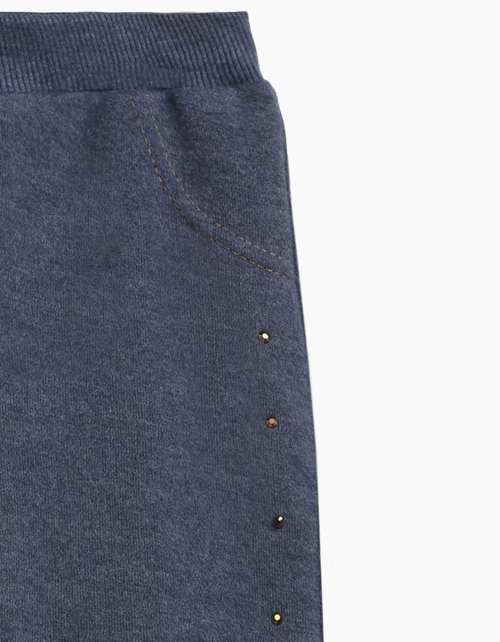 Брюки спортивного силуэта из меланжевого футера темно-синего цвета с отворотами снизу. Пояс из рибаны. По боковому шву украшены стразами.