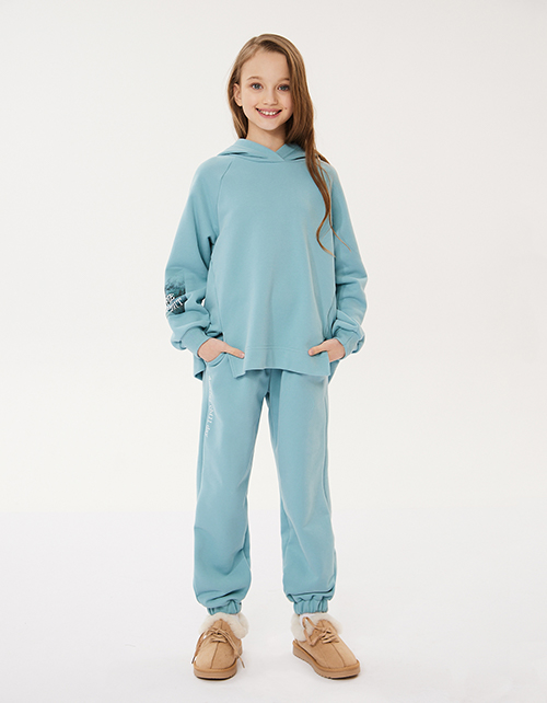Серо-голубые брюки-джоггеры для девочки. Комфортная модель на эластичном поясе с наклонными боковыми карманами. Модель выполнена из футера с браш-эффектом, что делает брюки мягкими и бархатистым, повышая износостойкость.