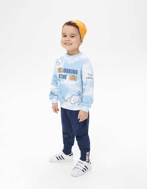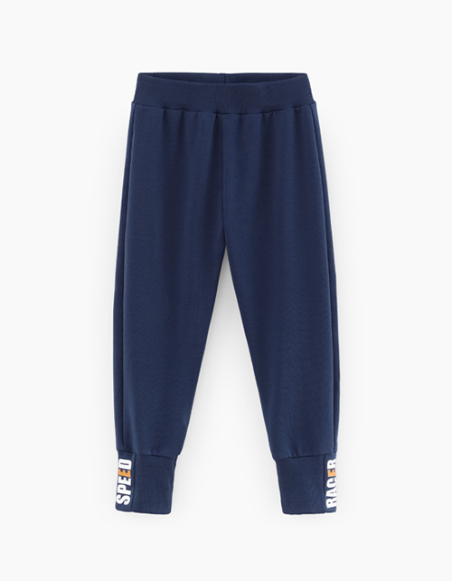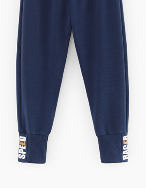 Модные тёмно-синие брюки-джоггеры для мальчика. Прямая модель со средней посадкой, снизу на рибане. Изделие из футера декорировано шрифтовым дизайном на манжетах по низу брюк.