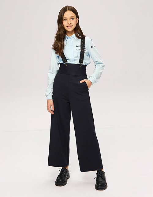 Темно-синие брюки-кюлоты с высокой талией, регулировкой по бретелям. Комфортная модель с наклонными боковыми карманами. Бретели декорированы тематическим буквенным принтом.