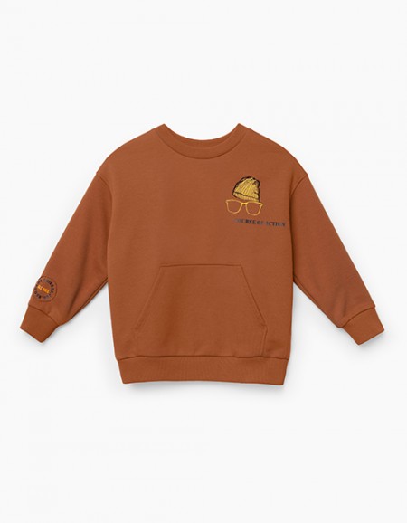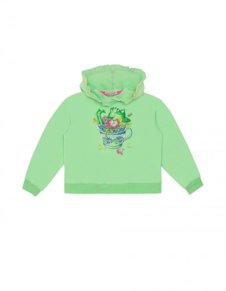 Бежевое худи для девочки. Декорировано набивным принтом с аппликацией из золотой пленки и металлической нашивкой с надписью.