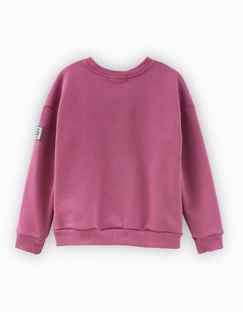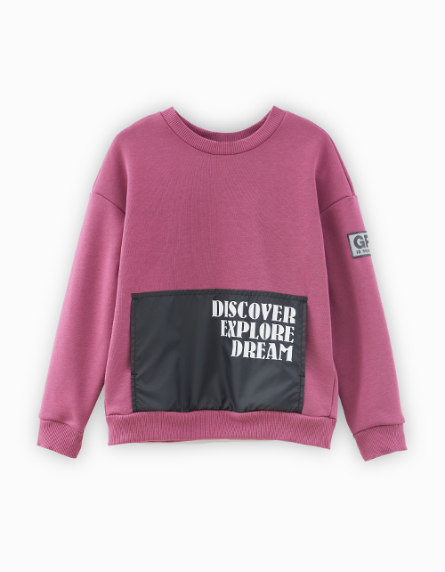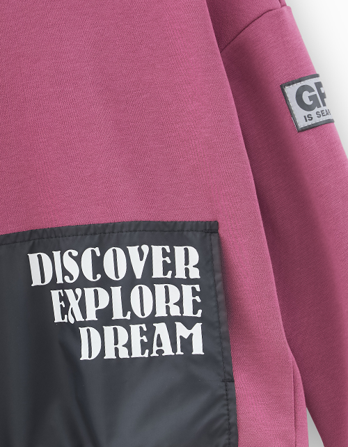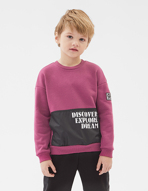 Свитшот в трендовом оттенке "Красная слива" для мальчика. Модель с акцентным карманом-кенгуру из плащевой ткани. Свитшот декорирован нашивкой и принтом.