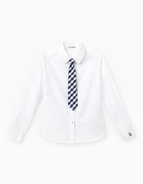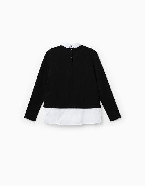 Джемпер-обманка свободного силуэта для девочки. Имитирует комплект из белой блузы и запахивающегося черного жакета. Выполнен из кулирной глади и сорочечной ткани. Декорирован фирменной эмблемой на воротнике. Застегивается на книпперы сзади