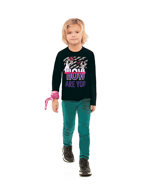 Черный лонгслив для мальчика прямого силуэта. Круглый вырез горловины. Принт на лицевой стороне в стилистике капсулы "Дружище Бакс".