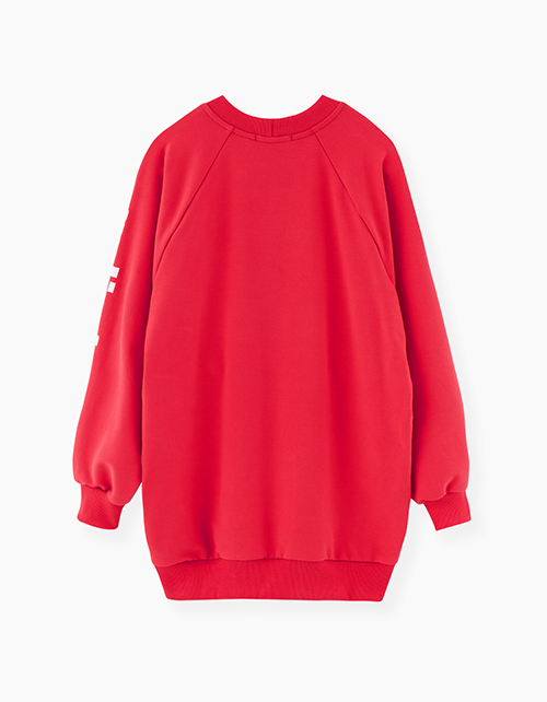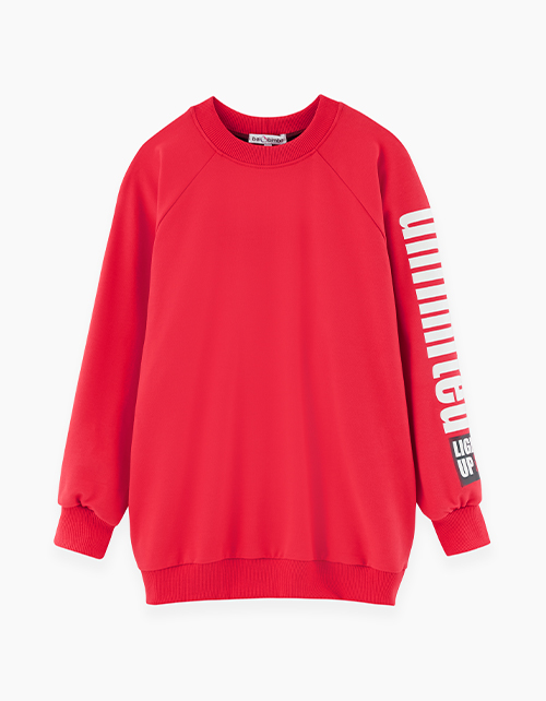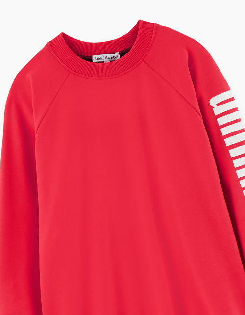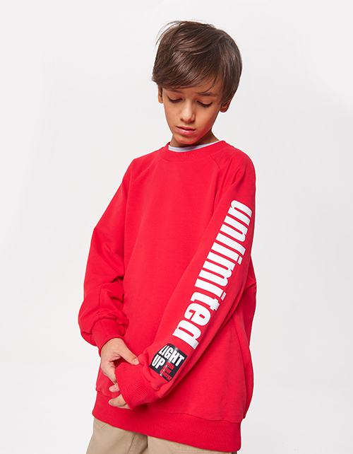 Красный oversize-свитшот для мальчика станет отличной основой джля образа. Модель декорирована тематическим принтом-надписью.